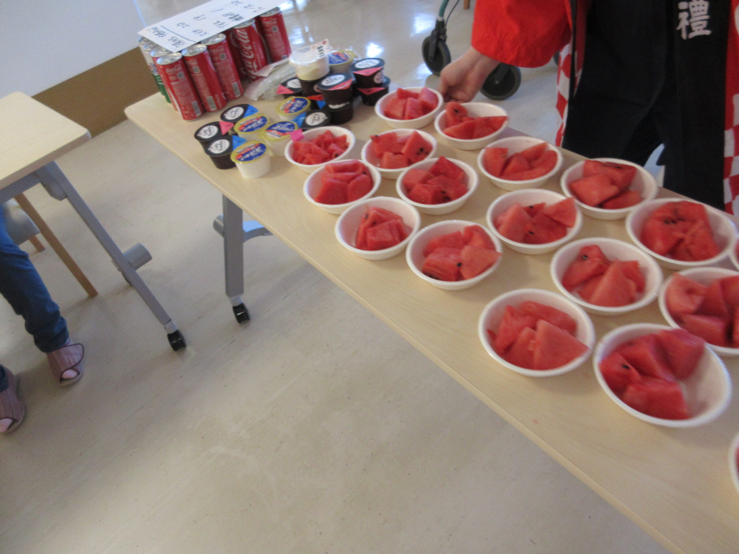 茶話会では季節感のあるスイカやアイスなどを皆さん笑顔で食べていました!